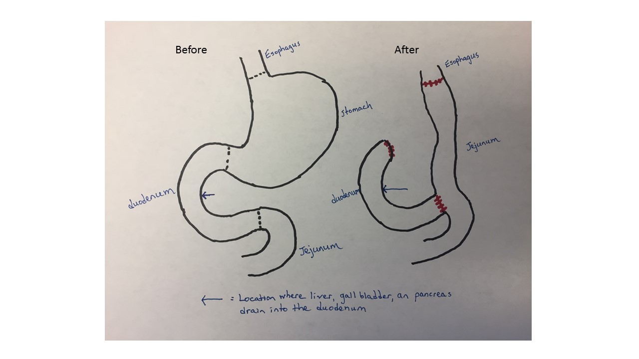 The procedure I will have is similar to the roux en y procedure that people undergo to lose weight through bariatric surgery with the addition of removing the stomach completely. The stomach will be disconnected from the esophagus and duodenum and removed. This is not a laproscopic procedure. The end of the duodenum will be sutured shut. The small intestine will be cut near the junction of the duodenum and jejunum and the proximal end of the jejunum will be attached to my esophagus. The distal end of the duodenum will then be attached to part of the jejunum.